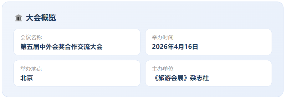 2026年4月16日,第五届中外会奖合作交流大会在北京盛大举办。本届大会以"精准对接、创新协同、价值提升"为主题,由《旅游会展》杂志社主办,汇聚来自国内外会奖、会展、文旅、场馆运营、数字技术等领域的数百位业界精英与重量级嘉宾。
